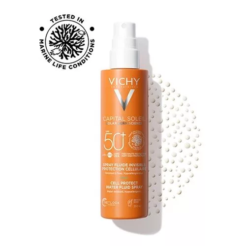 - CELL PROTECT WATER FLUID SPRAY SPF 50+ dostarcza zaawansowanej, 4-poziomowej ochrony (UVB, UVA, długie promieniowanie UVA & antyoksydacja), aby zapobiegać uszkodzeniom słonecznym nawet na poziomie komórek skóry.